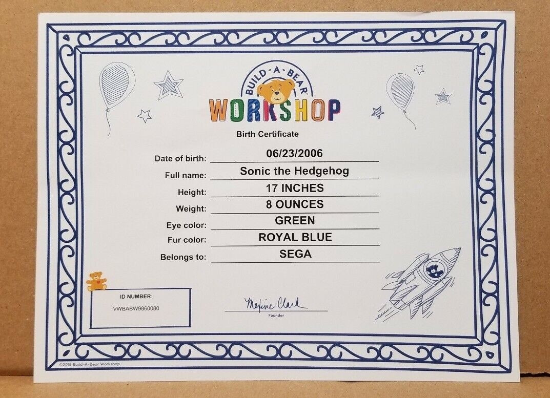 Build A Bear Movie Sonic The Hedgehog Birth Certificate EBay