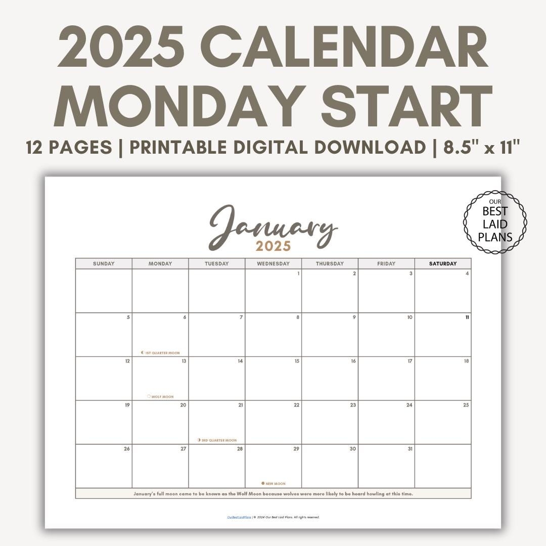 2025 Printable Calendar PDF Monday Start Calendar For 2025 Digital Download Simple Calendar For 2025 Monday Start Etsy