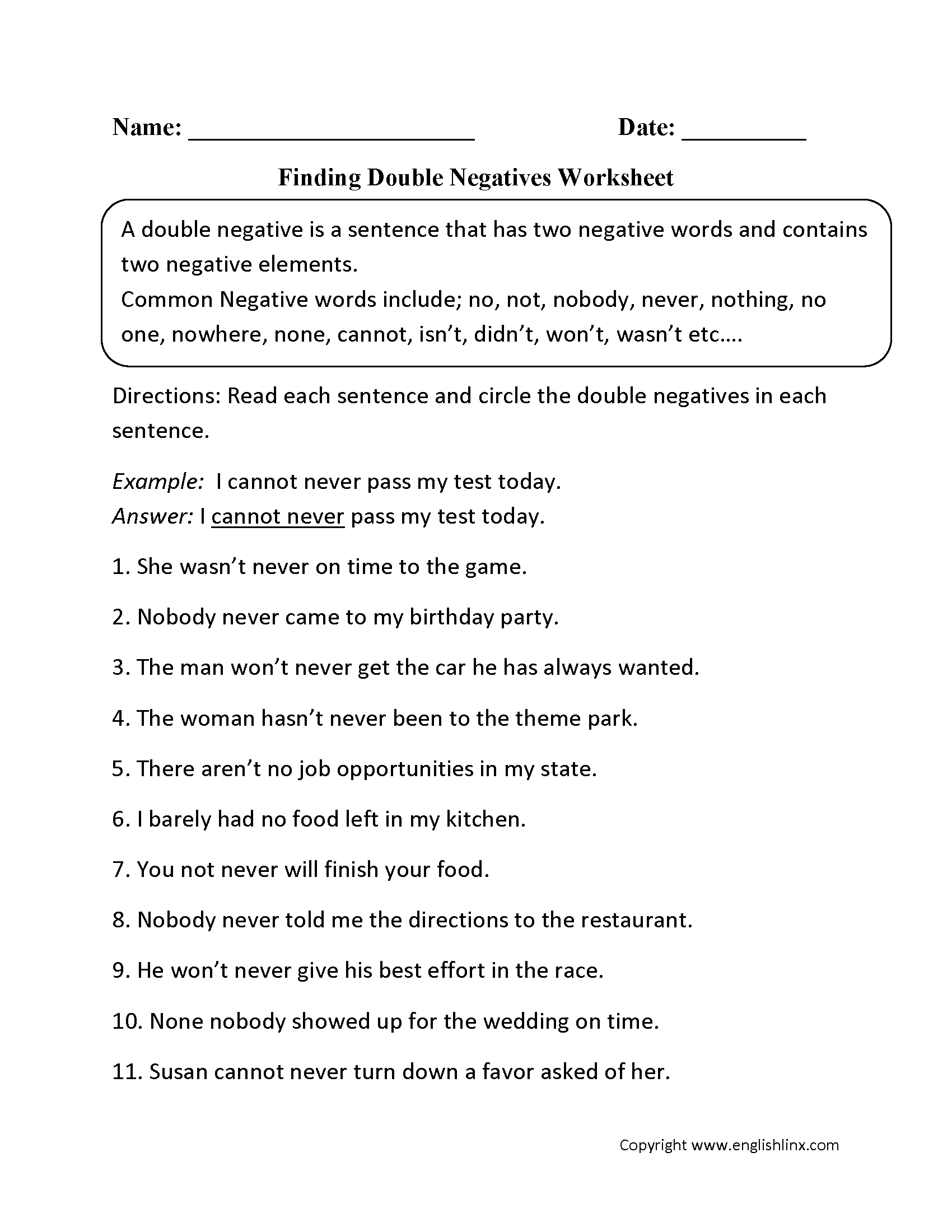 Our collection of worksheets covers a range of activities, from identifying double negatives in sentences to creating their own sentences using double negatives. Each worksheet is thoughtfully crafted to provide ample opportunities for practice and reinforcement.