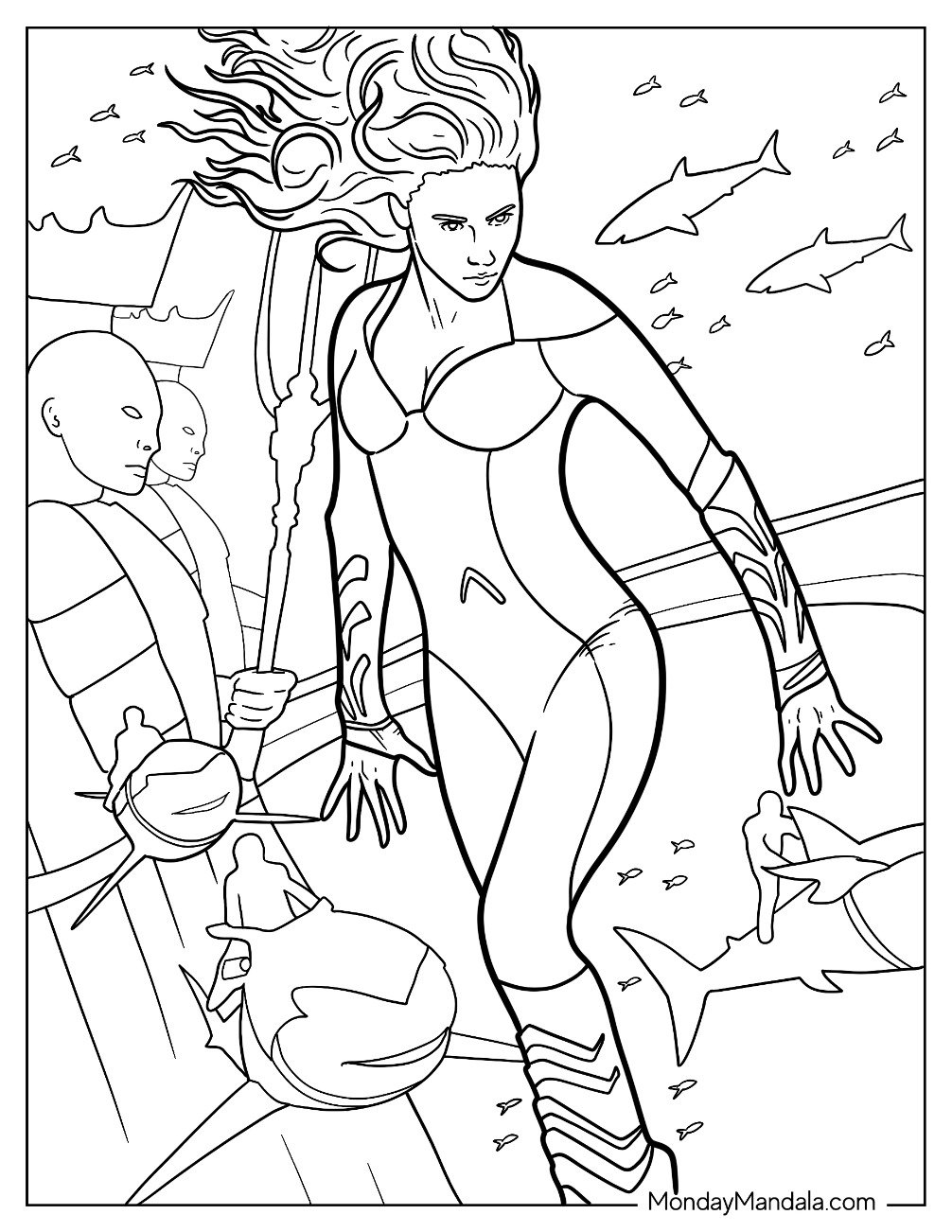 Mera, the powerful and fierce warrior princess, is a fan favorite character from the Aquaman series. Her stunning red hair and aqua-blue outfit make her a striking figure that kids and adults alike will love to color.