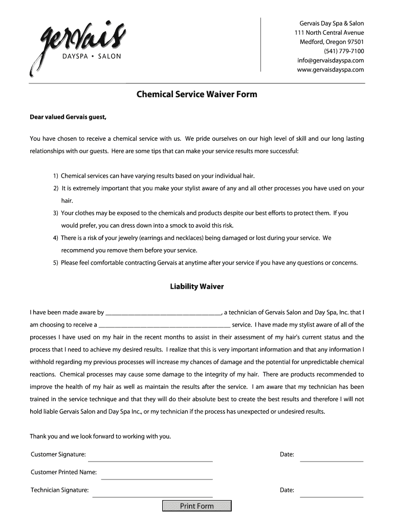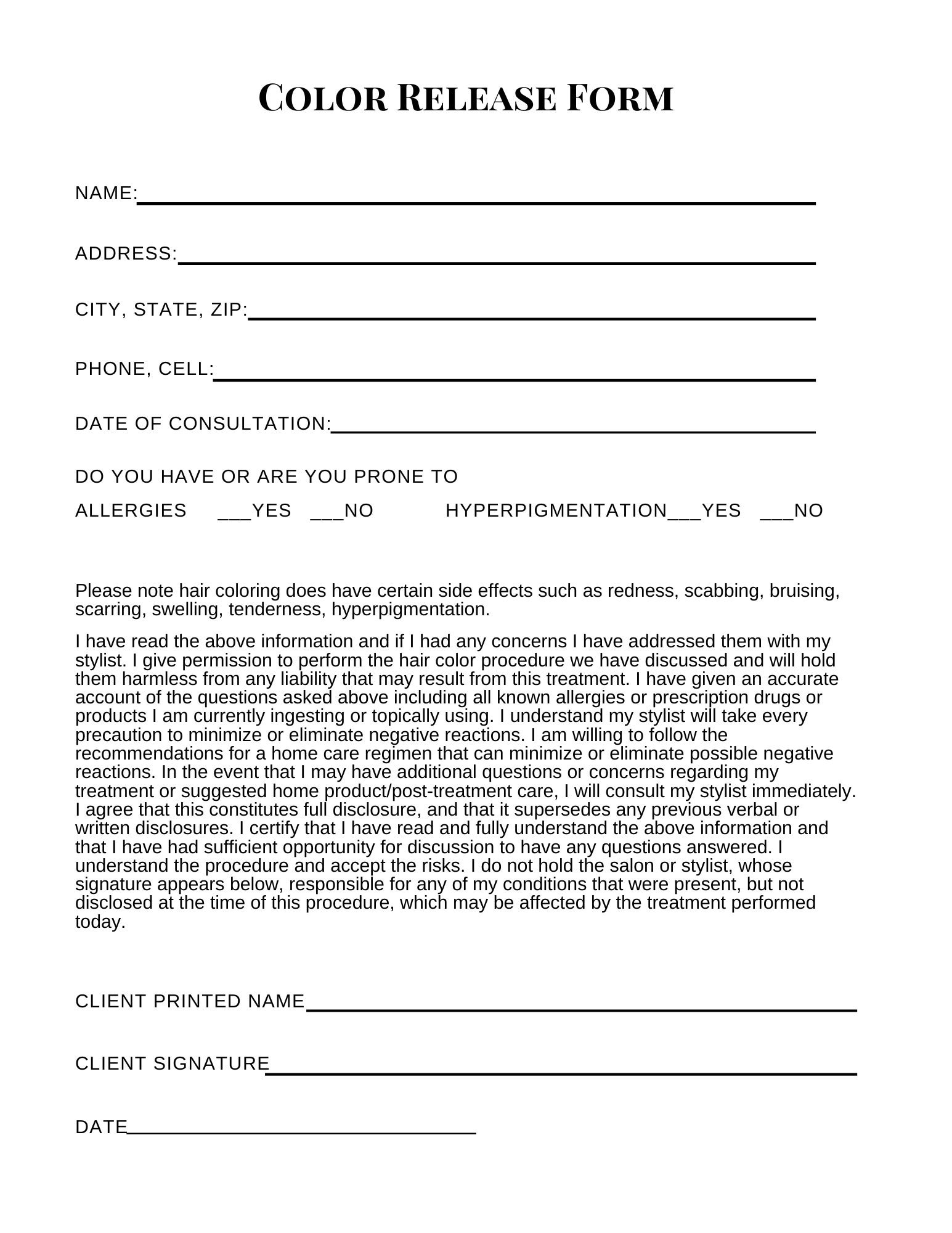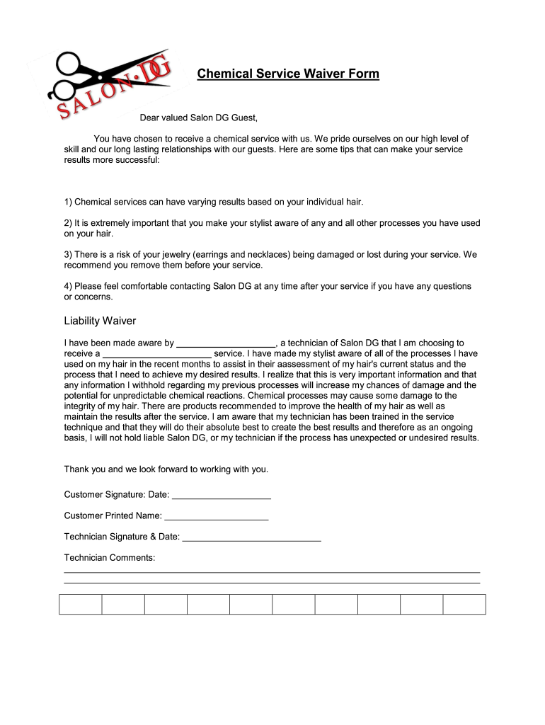 Simply print out the form, have your client read and sign it before any chemical treatment, and keep it on file for your records. It’s a straightforward process that will help you stay organized and compliant with industry regulations.