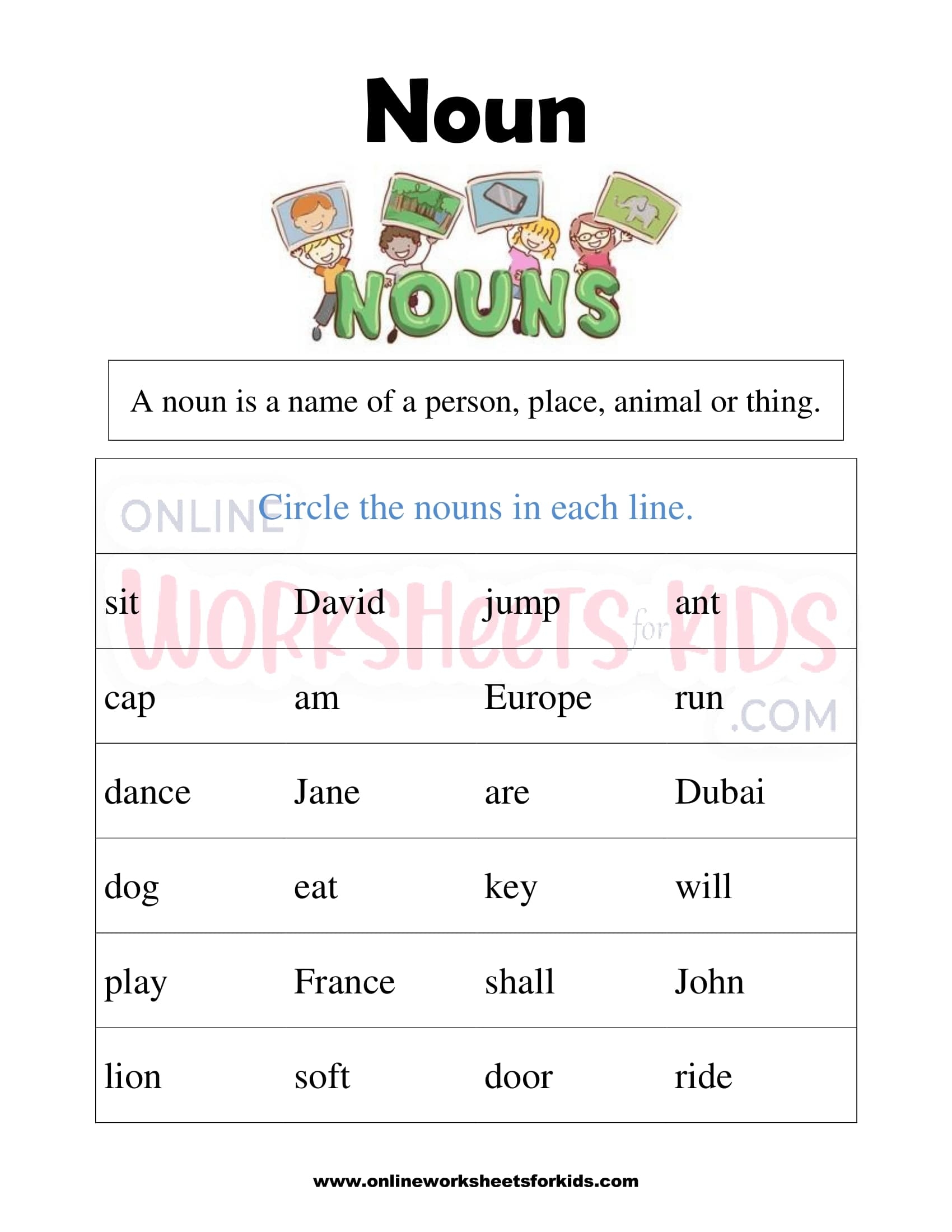This worksheet is designed to help children understand the basic concept of nouns and enhance their language skills. It includes various sentences with nouns hidden within them, challenging kids to locate and underline the nouns in each sentence.