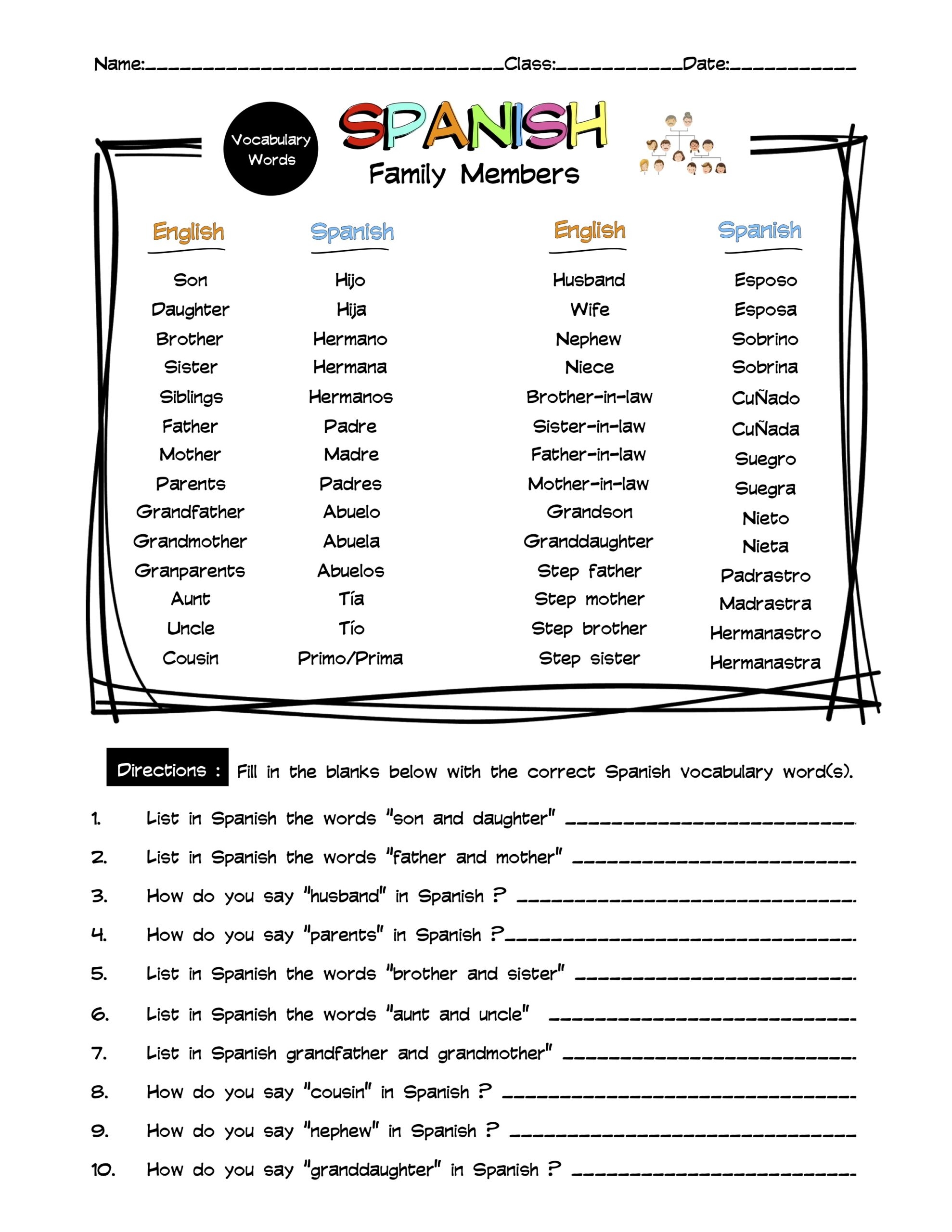 Spanish Family Members Vocabulary Word List Worksheet Answer Key Made By Teachers